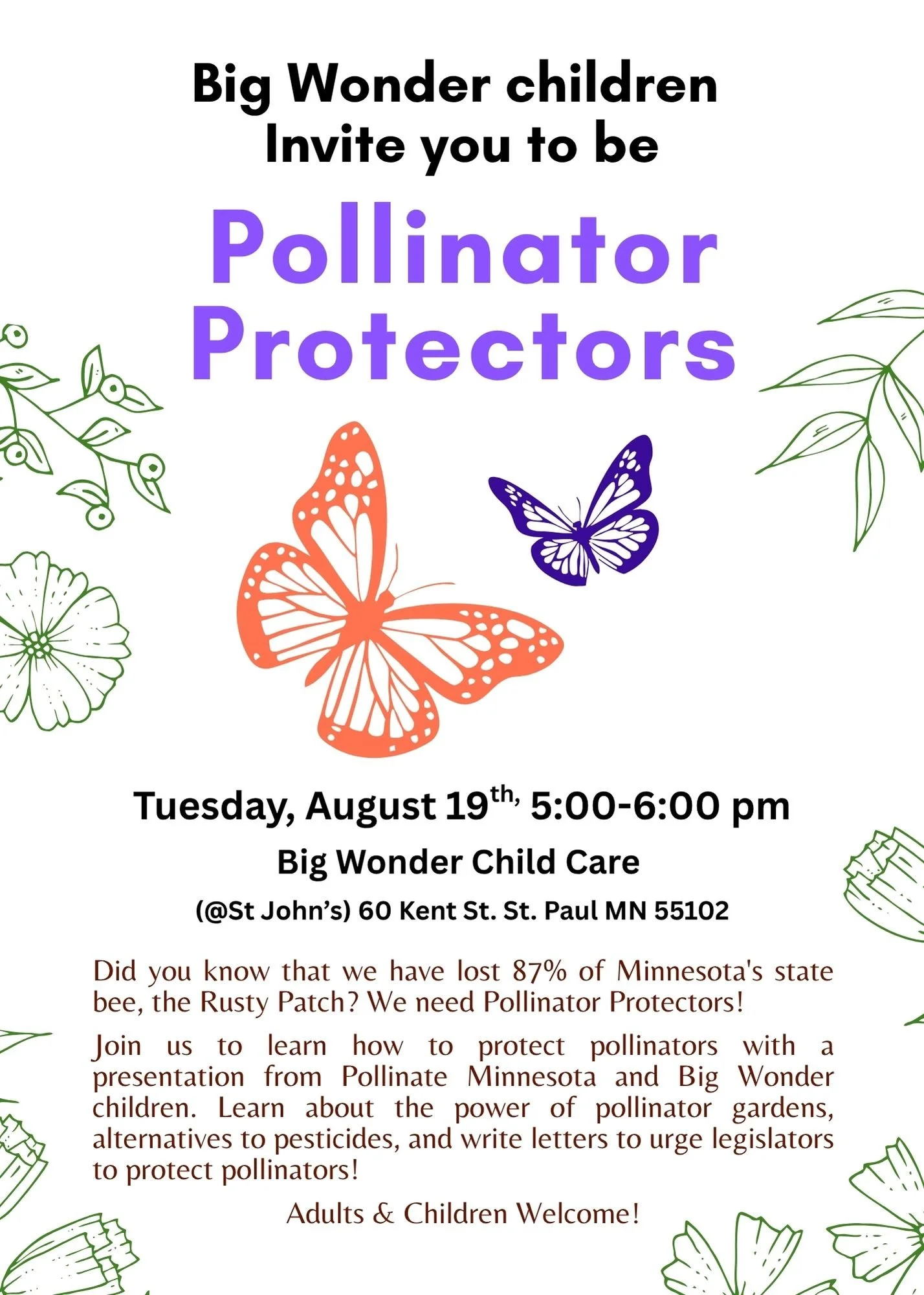 We invite Big Wonder families, friends, and neighbors to join us as pollinator protectors! We are hosting a community event to create awareness about the need to protect pollinators. We will have art, letter signing, and a presentation featuring children and experts from Pollinate MN, along with live bees!